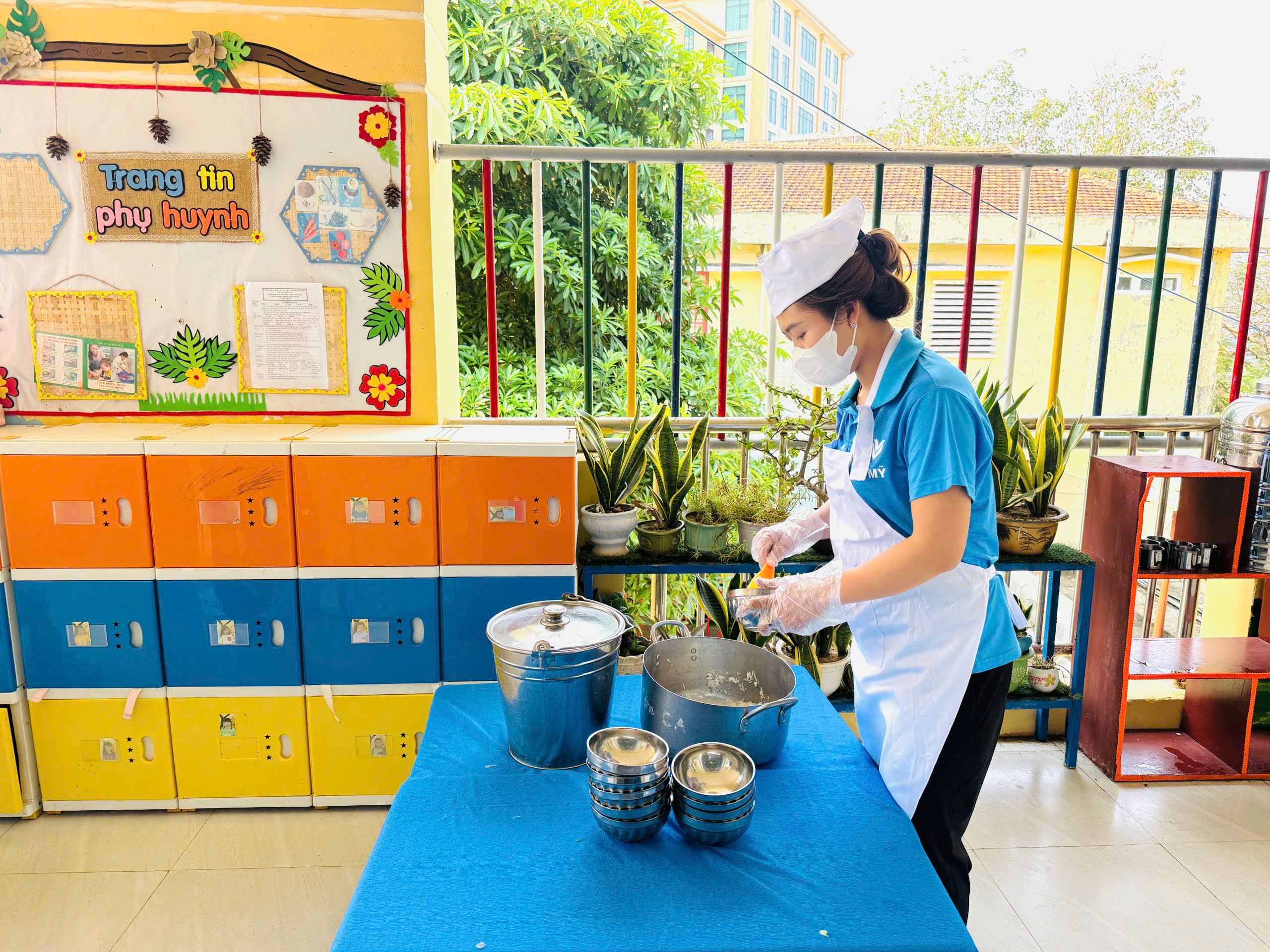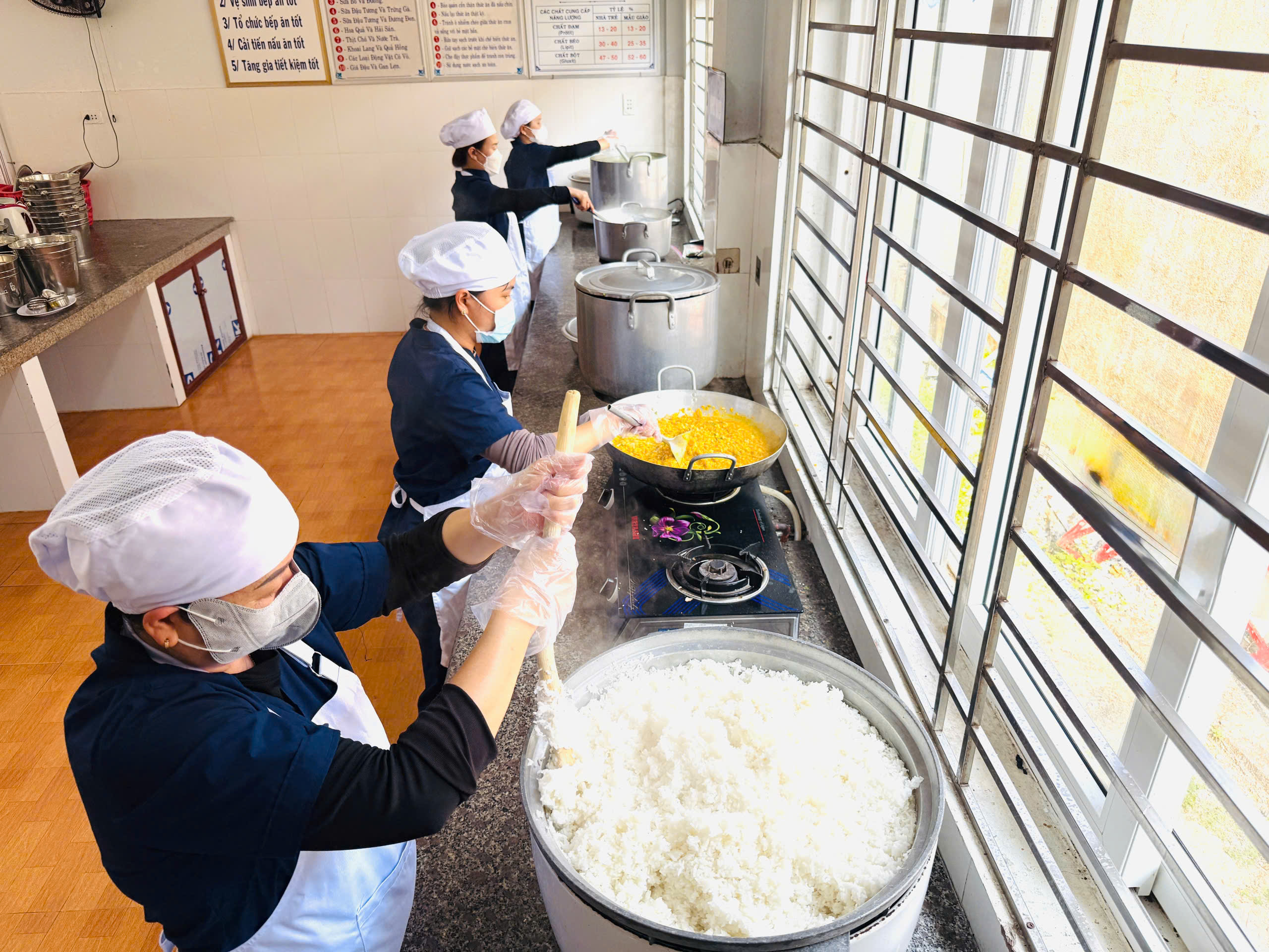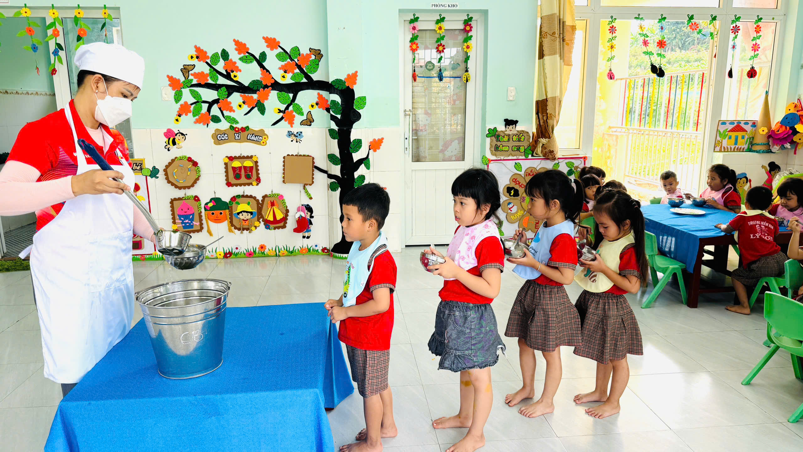 🍲 Khi thức ăn đã chín, các món ăn được đựng trong xô inox sạch sẽ, có nắp đậy cẩn thận trước khi chuyển về các lớp.