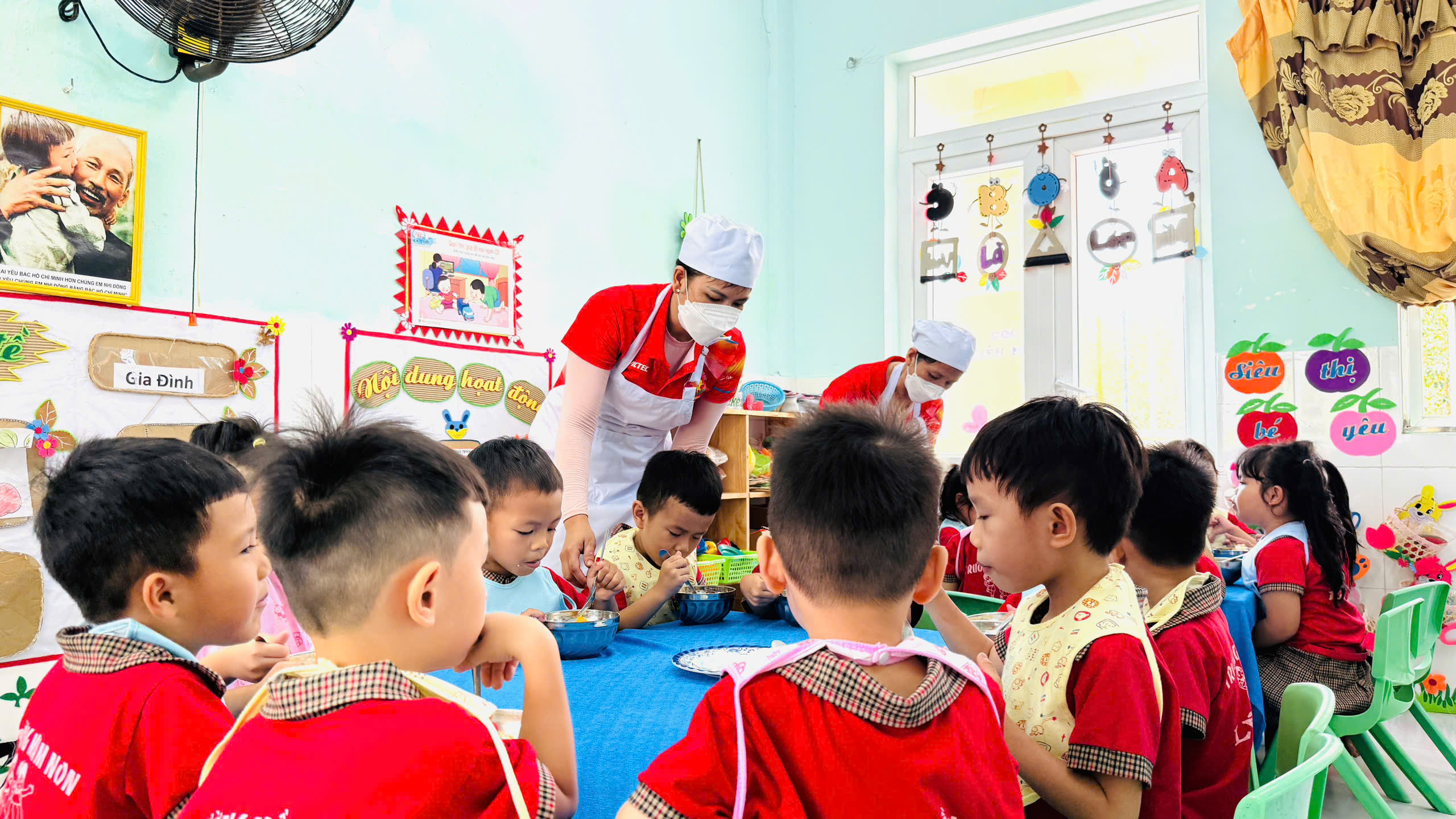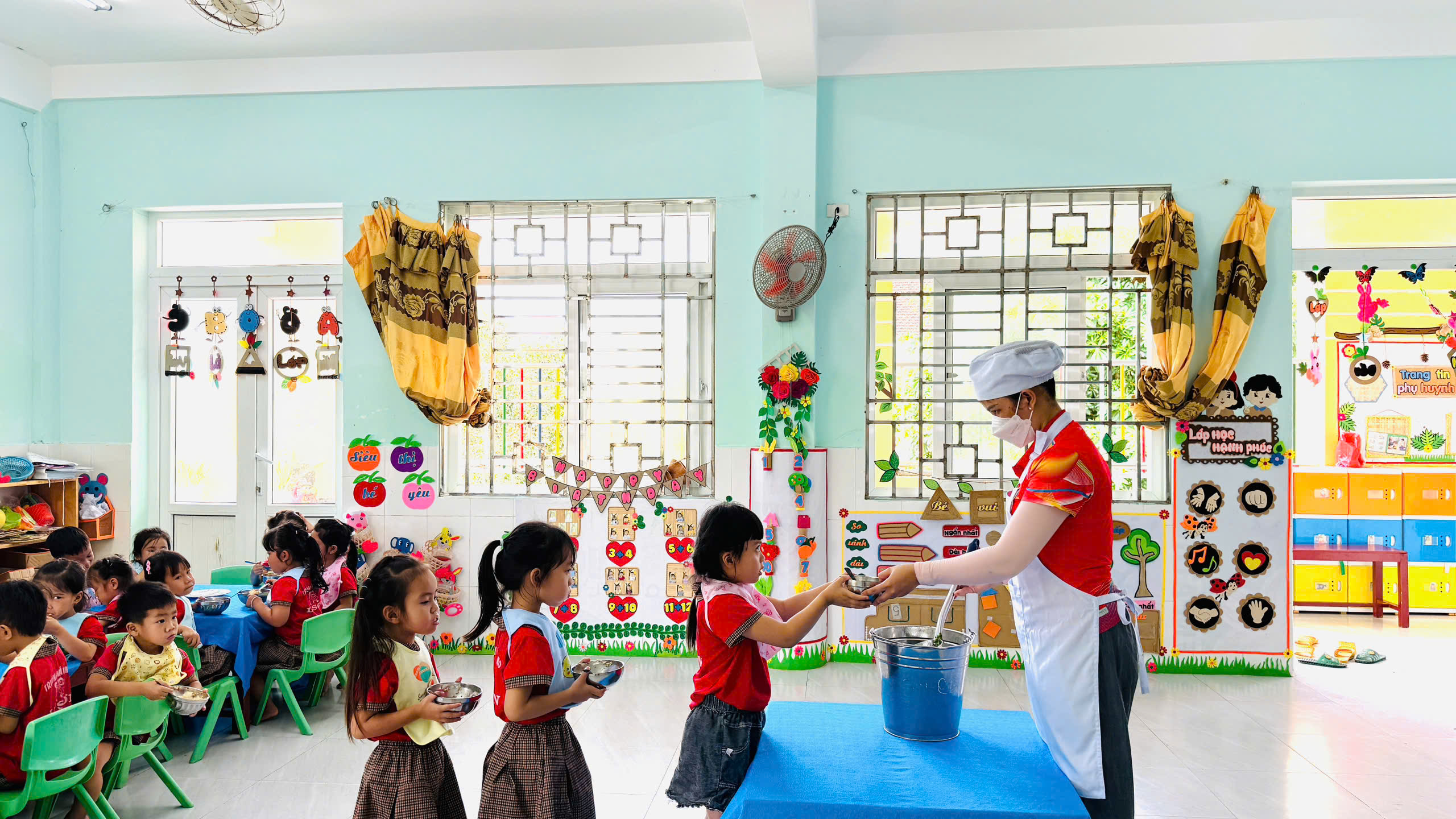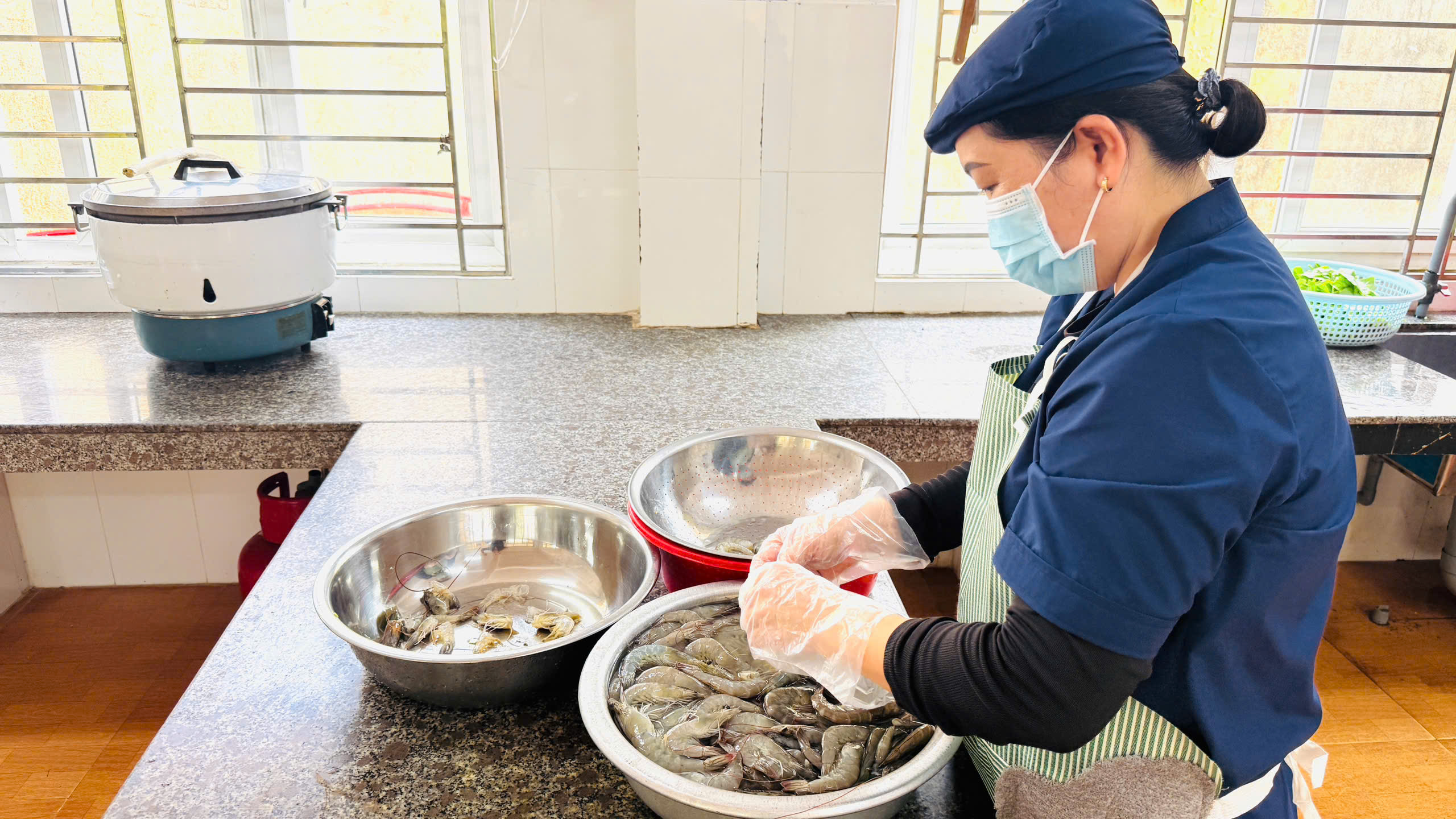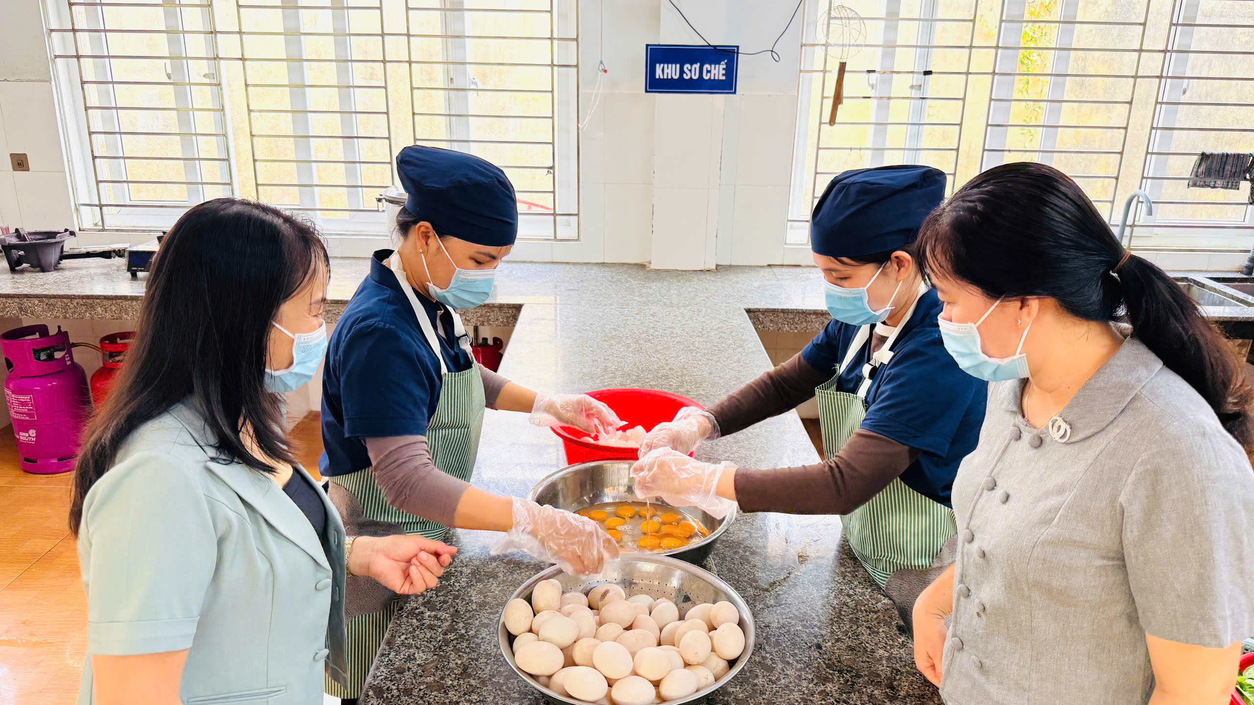 🍲 Khi thức ăn đã chín, các món ăn được đựng trong xô inox sạch sẽ, có nắp đậy cẩn thận trước khi chuyển về các lớp.