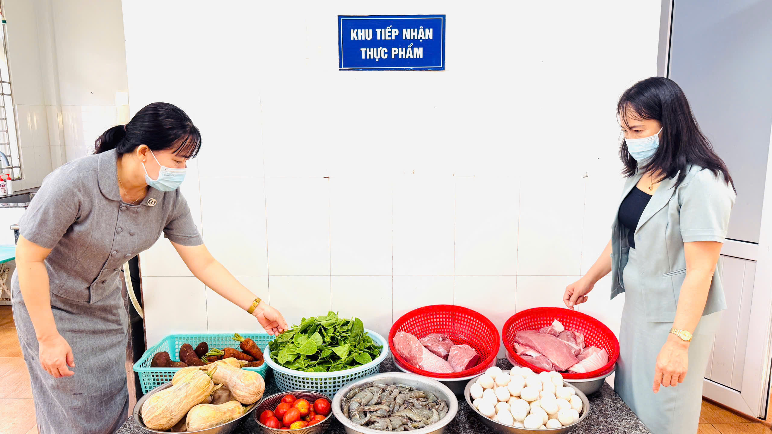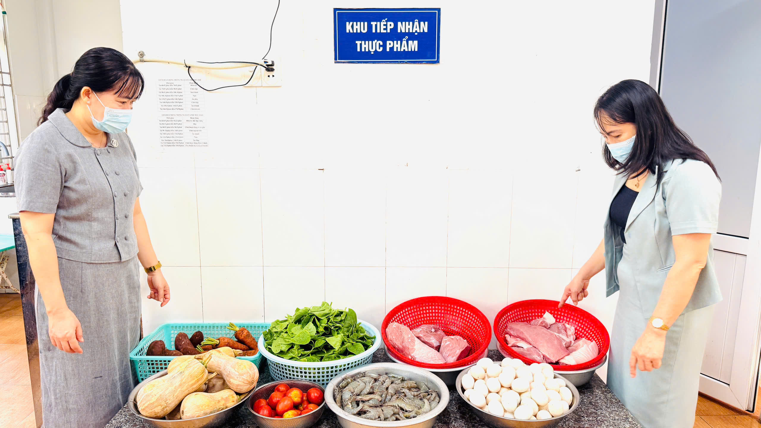🌼Ngay từ đầu buổi, Ban giám hiệu nhà trường đã trực tiếp kiểm tra thực phẩm tươi sống trước khi đưa vào chế biến. Rau củ, thịt trứng phải tươi ngon, đảm bảo chất lượng, có nguồn gốc rõ ràng, tất cả đều được lựa chọn cẩn thận, kỹ lưỡng.