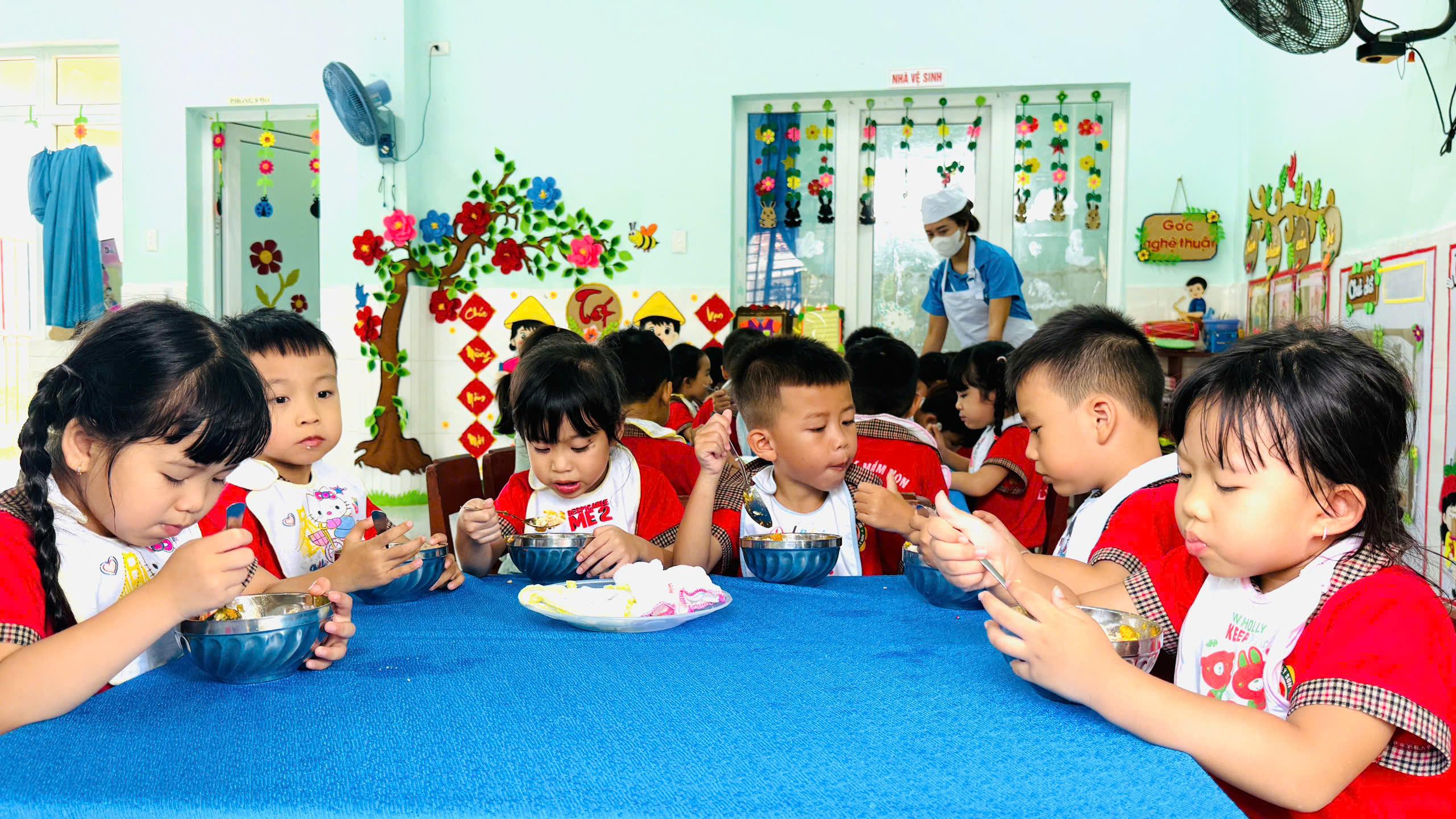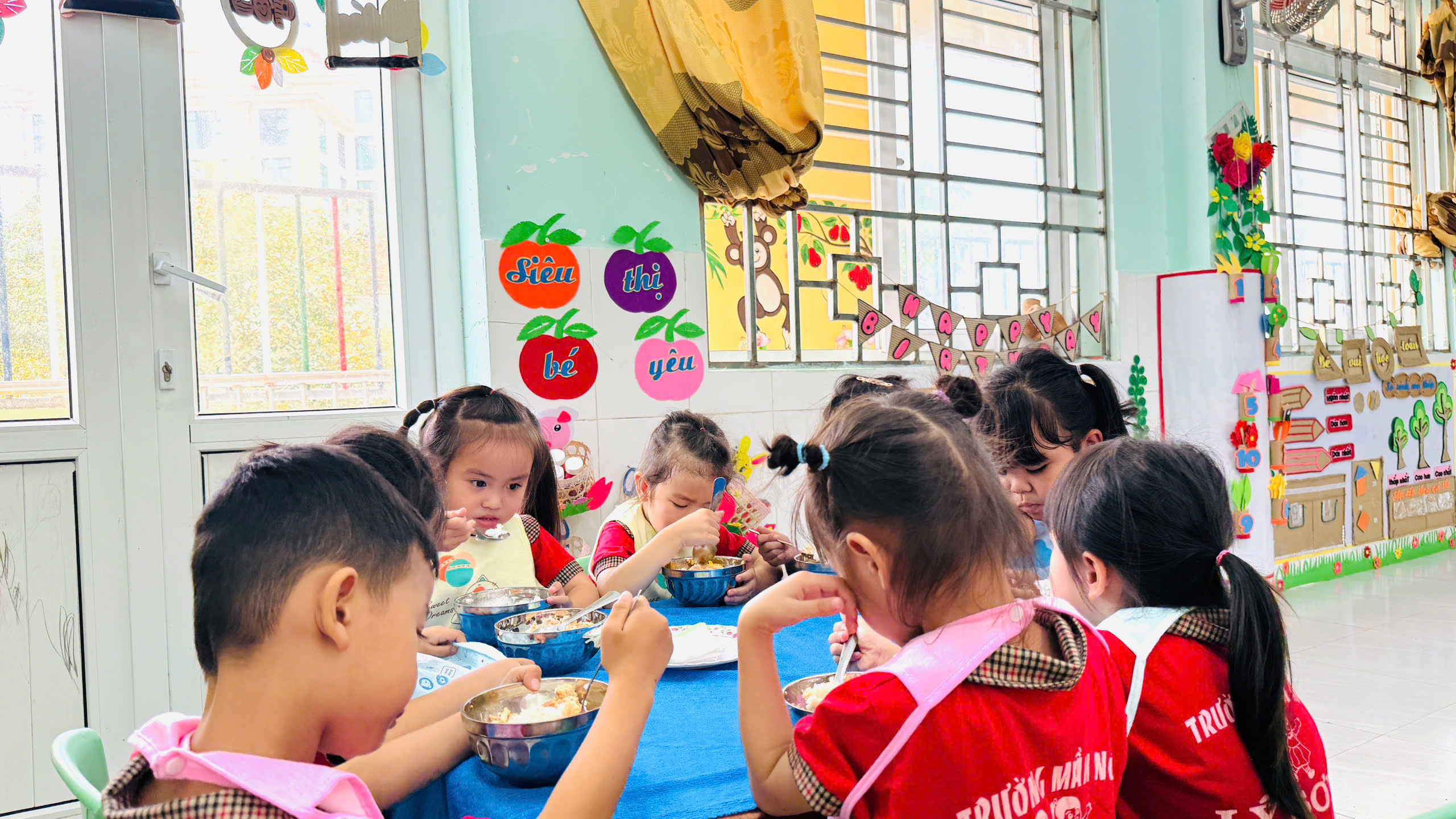 👧👦 Đến giờ ăn, các cô giáo nhẹ nhàng hướng dẫn, động viên trẻ ăn ngon miệng. Không khí giờ ăn vui vẻ, ấm áp, nhiều bé ăn hết suất, hào hứng với bữa ăn của mình.
